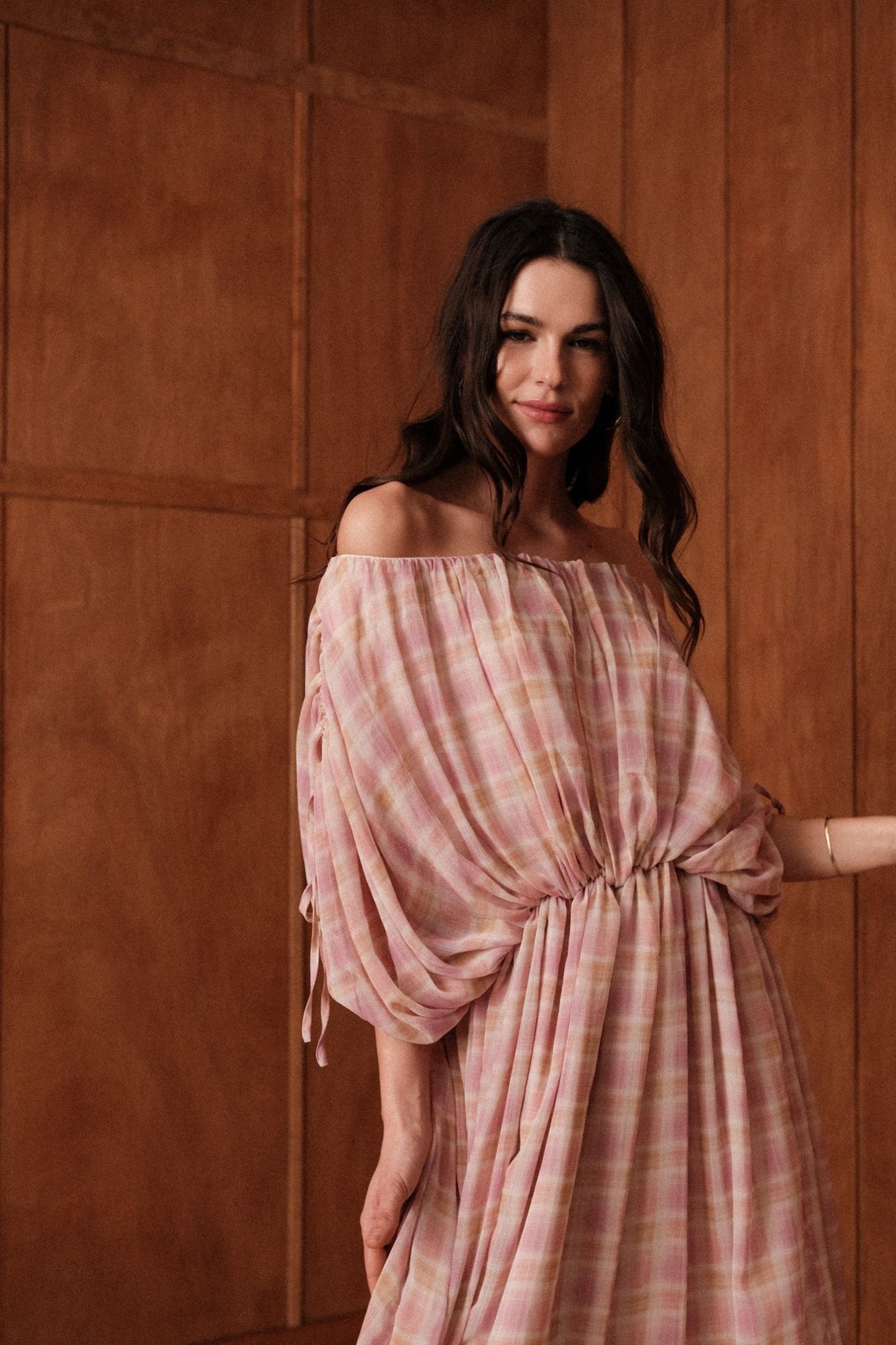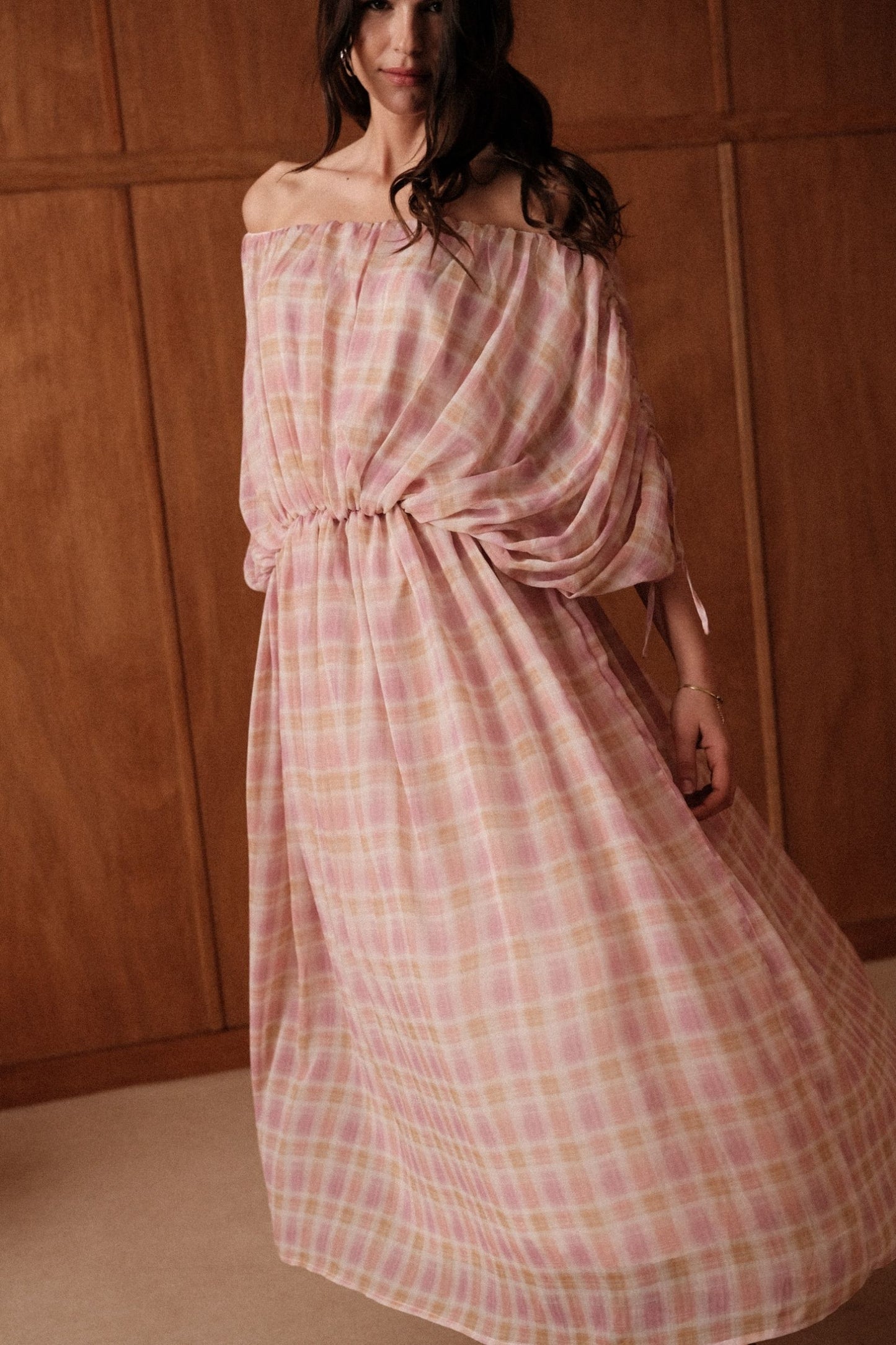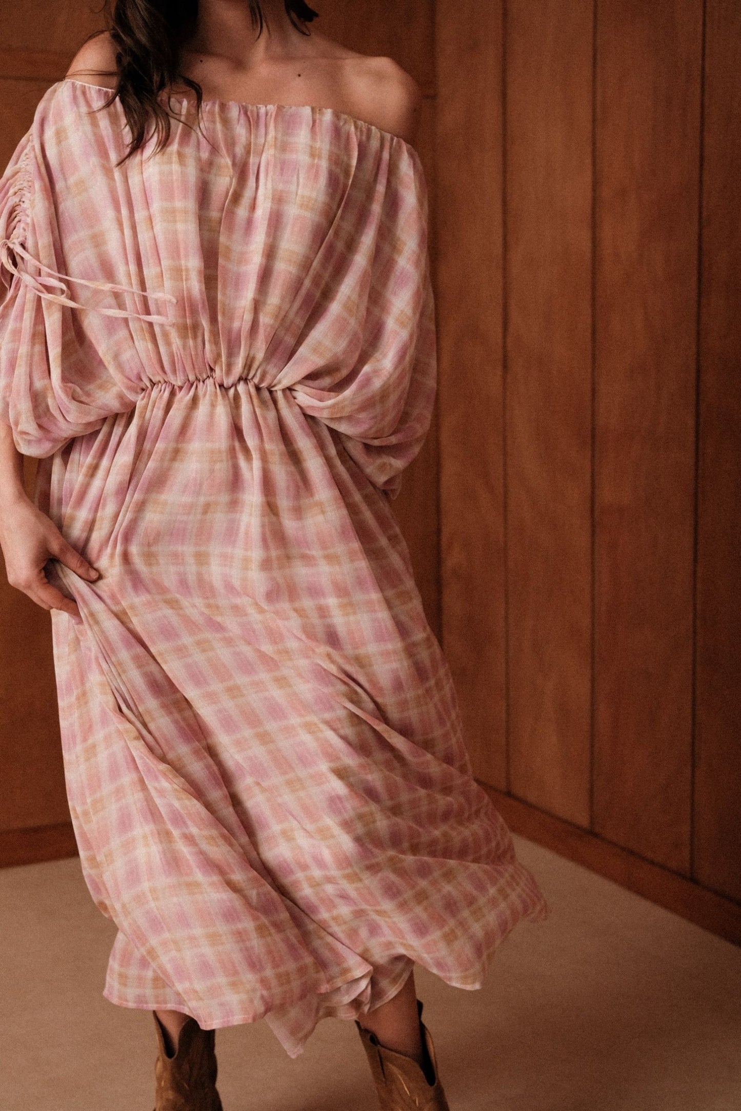 La robe Gaïa glisse sur les épaules et s'abandonne. En voile léger à grands carreaux rose et jaune pâle, elle se porte épaules dénudées, maintenue par un élastique froncé à la taille et des manches nouées aux poignets.