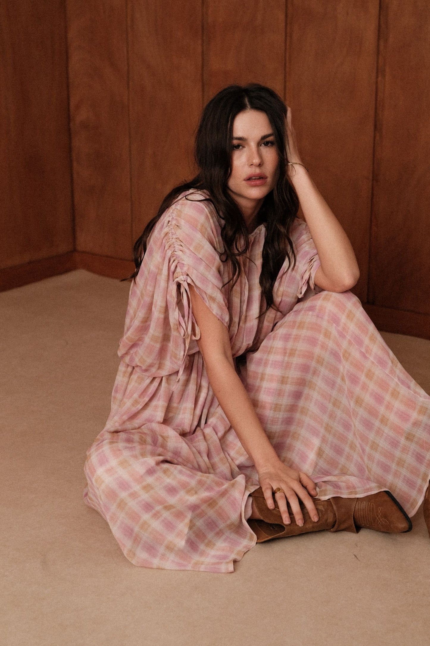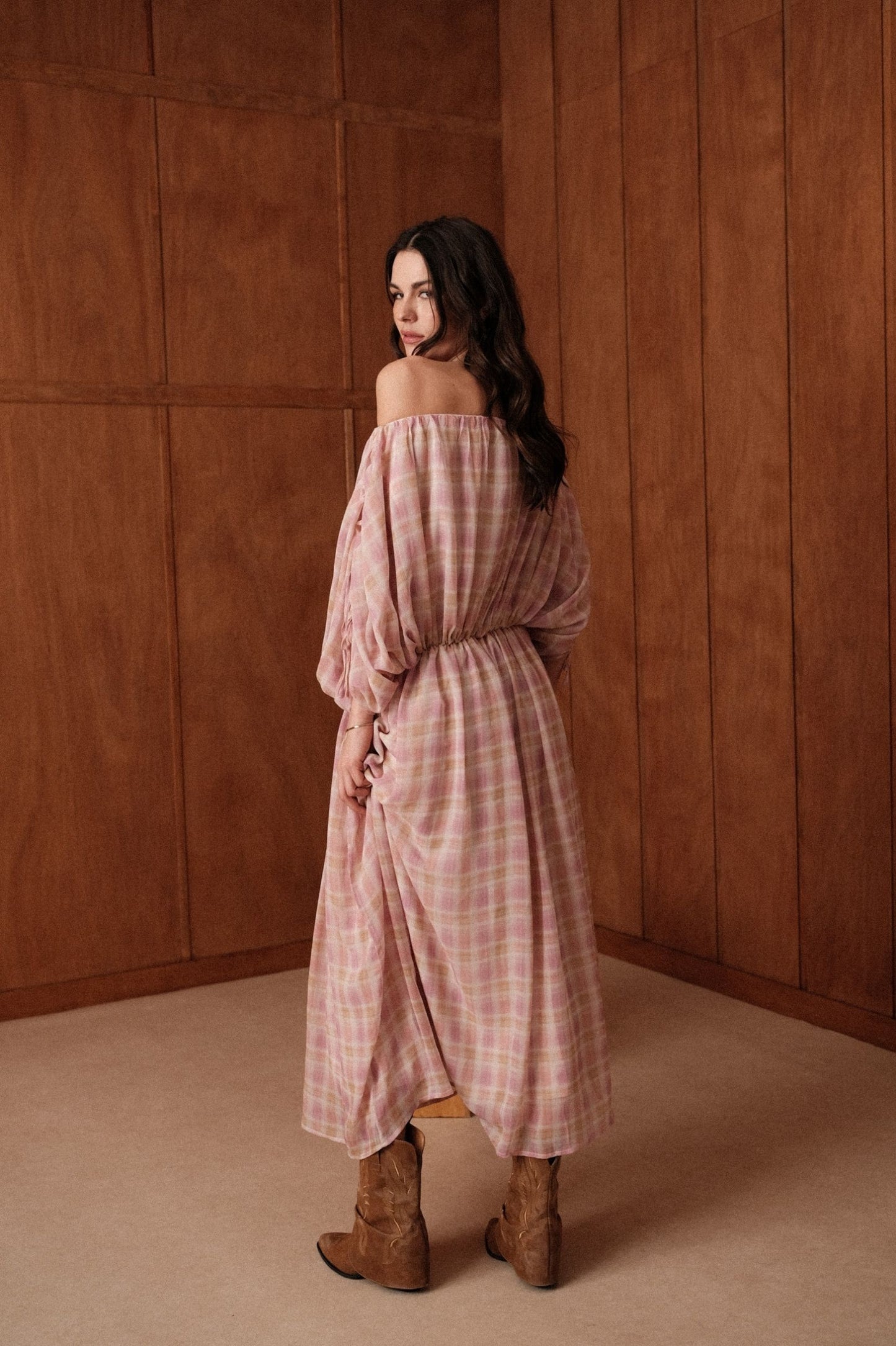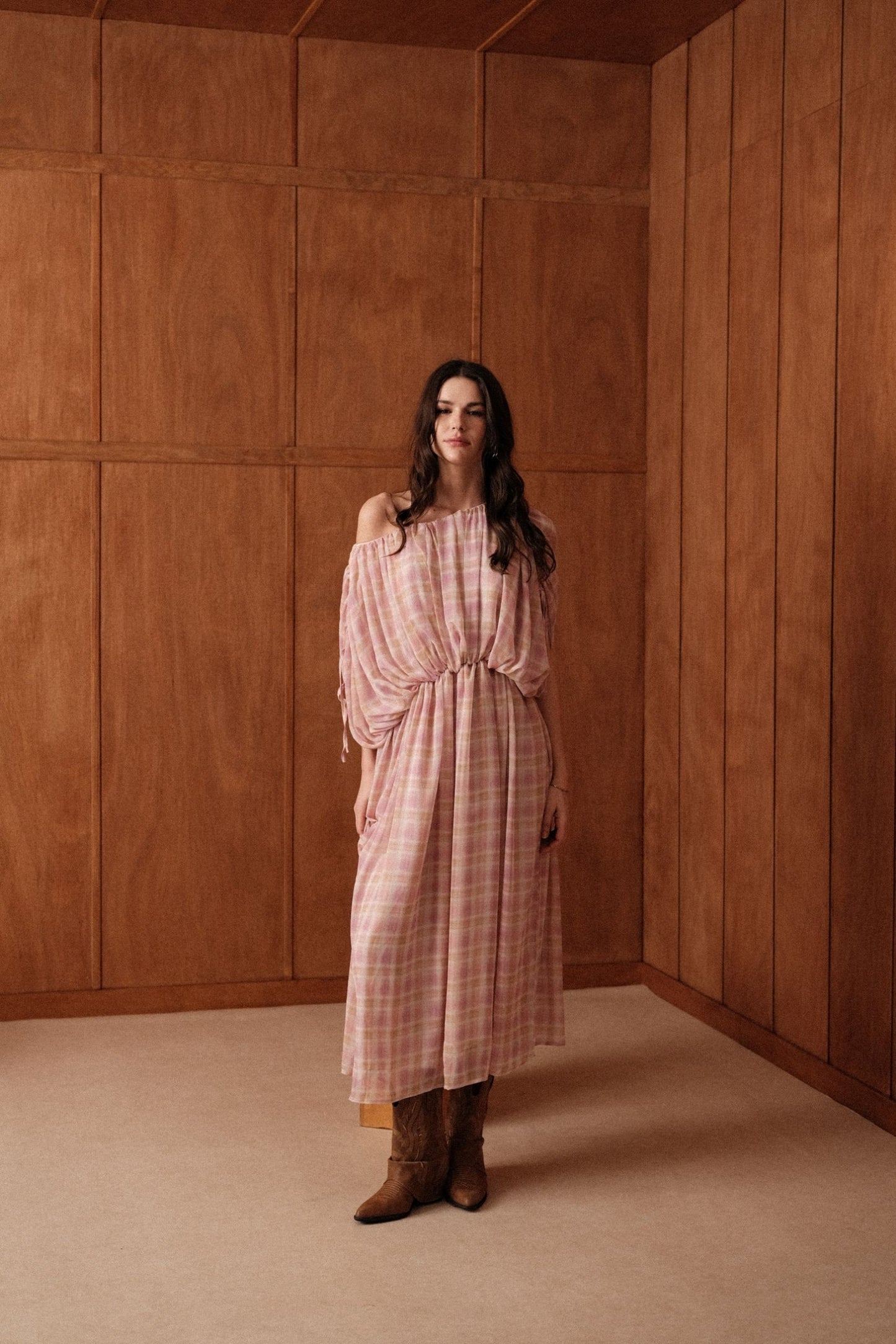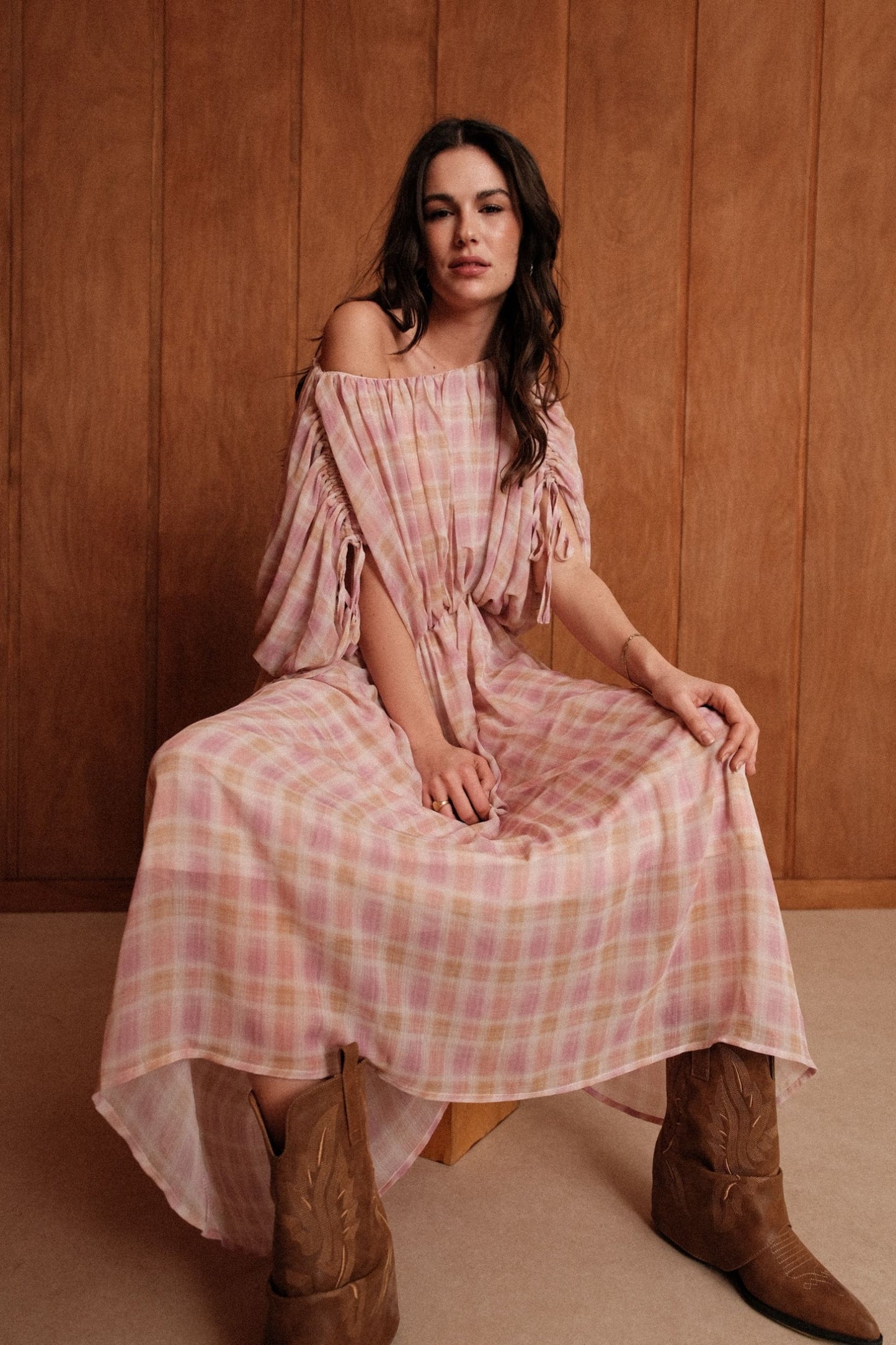 La robe Gaïa glisse sur les épaules et s'abandonne. En voile léger à grands carreaux rose et jaune pâle, elle se porte épaules dénudées, maintenue par un élastique froncé à la taille et des manches nouées aux poignets.